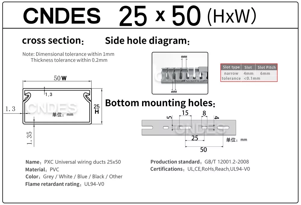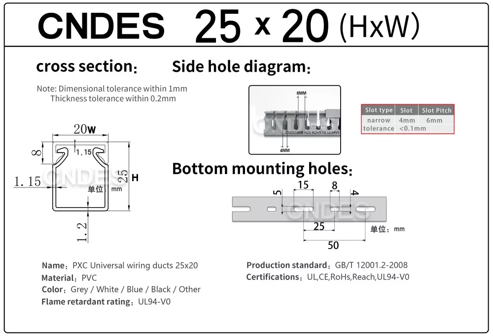 CNDES ၏ Type 25 cable trays များတွင် 25*20၊ 25*25 နှင့် 25*50 တို့ ပါဝင်သည်။